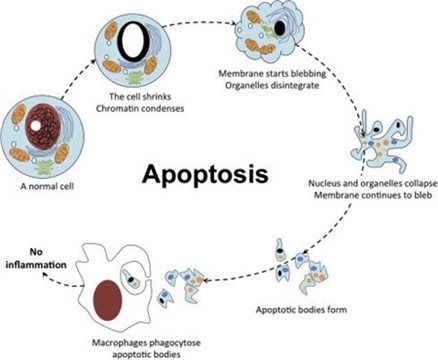 凋亡的特征具有明顯的形態(tài)變化以及特定caspase和線粒體控制通路的激活。凋亡細(xì)胞出現(xiàn)細(xì)胞體積縮小,與周圍細(xì)胞脫離,然后細(xì)胞質(zhì)密度增加,通透性改變,染色質(zhì)濃縮和核碎裂,并顯示出稱為膜起泡的典型變形的膜,膜內(nèi)側(cè)磷酯酰絲氨酸外翻到膜表面,胞膜結(jié)構(gòu)仍然完整,無(wú)內(nèi)容物外溢,不引起周圍的炎癥反映。膜起泡可導(dǎo)致在垂死細(xì)胞邊緣形成小囊泡,稱為凋亡小體。凋亡小體可迅速被周圍的吞噬細(xì)胞吞噬。凋亡可以通過(guò)內(nèi)在或外在通路觸發(fā),內(nèi)在通路可以通過(guò)細(xì)胞應(yīng)激、DNA損傷、發(fā)育信號(hào)、存活因子缺失被激活,外在通路則是通過(guò)檢測(cè)到來(lái)自其他細(xì)胞的細(xì)胞外死亡信號(hào)來(lái)觸發(fā)的。