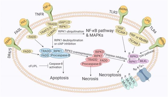 Fas又稱CD95,是由325個(gè)氨基酸組成的受體分子,它與其配體FASLG(CD178)結(jié)合可以啟動(dòng)凋亡信號(hào)的轉(zhuǎn)導(dǎo)引起細(xì)胞凋亡。Fas具有特殊的死亡結(jié)構(gòu)域(DD,death domain),三聚化的Fas和FASLG結(jié)合后,使三個(gè)DD相聚成簇,吸引了胞漿中另一種帶有相同死亡結(jié)構(gòu)域的蛋白FADD。FADD是死亡信號(hào)轉(zhuǎn)錄中的一個(gè)連接蛋白,它由兩部分組成:C端(DD結(jié)構(gòu)域)和N端(DED)部分。C端與Fas的DD結(jié)構(gòu)域結(jié)合,N端連接另一個(gè)帶有DED的后續(xù)成分,由此引起N端DED隨即與無(wú)活性的caspase-8發(fā)生反應(yīng),進(jìn)而引起caspases級(jí)聯(lián)反應(yīng),誘發(fā)細(xì)胞凋亡。Fas/FASLG涉及許多癌癥和免疫疾病的發(fā)病機(jī)制,如多發(fā)性硬化癥[2]。