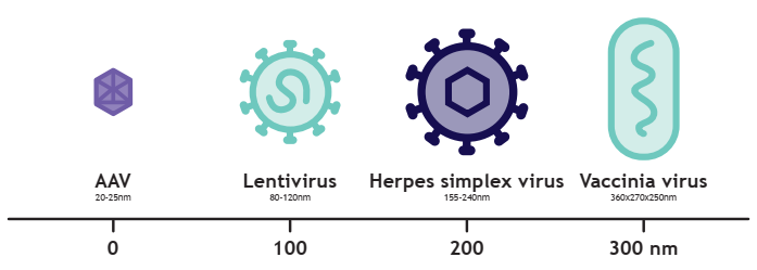 常用于基因治療的病毒載體尺寸示意圖:腺相關(guān)病毒AAV、慢病毒LVV、單純皰疹病毒HSV和痘苗病毒VACV