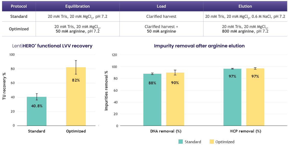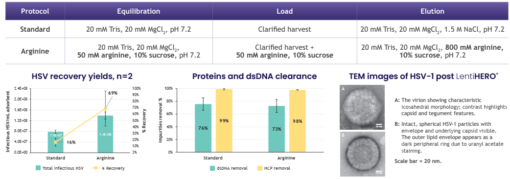 用0.8M精氨酸洗脫,HSV回收率可達(dá)到69%,LentiHERO®載量可達(dá)1.4E+8 IU/ml,同時(shí)實(shí)現(xiàn)高效的雜質(zhì)去除。