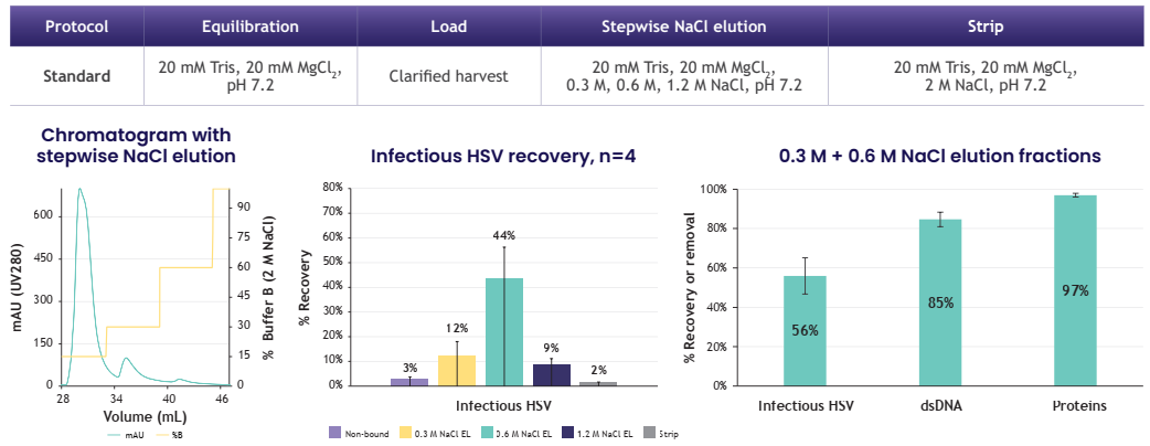 感染性HSV回收率為56%,LentiHERO®載量可達(dá)9.2E+9 IU/ml,大部分感染性HSV在0.6M NaCl條件下被洗脫。