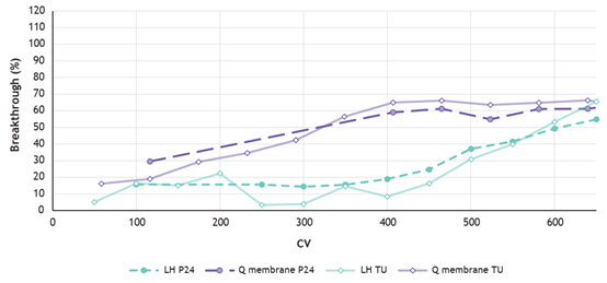 下圖是VSV-G LVV樣品在不同流速下通過LentiHERO(LH)與Q膜流穿液的TU和p24檢測(cè)結(jié)果,LentiHERO對(duì)LVV的結(jié)合能力顯著高于Q膜。由此表明,LeniHERO在LVV流穿之前能夠處理更大體積的料液。