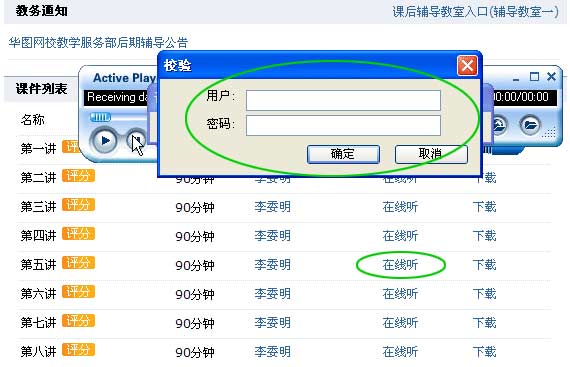 6. 返回會員中心,點擊在線聽,彈出認(rèn)證頁面,輸入用戶名和密碼,點擊播放,即可收看課件