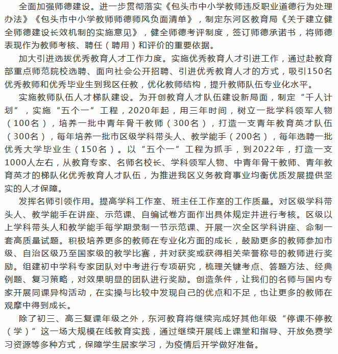 關(guān)注教師招聘考試的小伙伴們要注意了,目前在包頭教育在線微信公眾號上發(fā)布了2020年東河區(qū)教育工作規(guī)劃,并且在計劃中提到了要加大引進選拔優(yōu)秀教育人才工作力度,實施優(yōu)秀教育人才引進工作,通過赴教育部重點師范院校選聘、面向社會公開招聘、引進優(yōu)秀教育人才的方式,吸引150名優(yōu)秀教師和優(yōu)秀畢業(yè)生到我區(qū)任教,優(yōu)化教師結(jié)構(gòu),提升教師隊伍專業(yè)化水平。