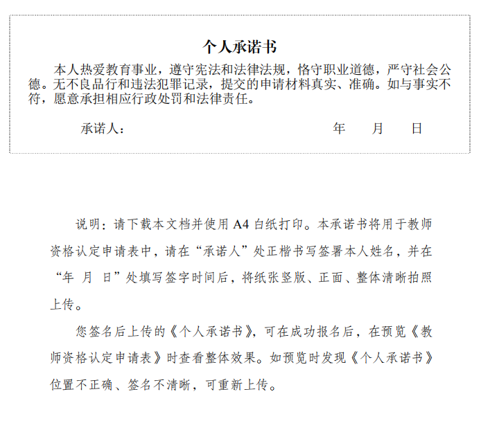 說明:請下載本文檔并使用 A4 白紙打印。本承諾書將用于教師資格認(rèn)定申請表中,請在“承諾人”處正楷書寫簽署本人姓名,并在“年 月 日”處填寫簽字時間后,將紙張豎版、正面、整體清晰拍照上傳(在上傳個人承諾書時,只需截圖個人承諾書部分即可。)。您簽名后上傳的《個人承諾書》,可在成功報名后,在預(yù)覽《教師格認(rèn)定申請表》時查看整體效果。如預(yù)覽時發(fā)現(xiàn)《個人承諾書》位置不正確、簽名不清晰,可重新上傳。