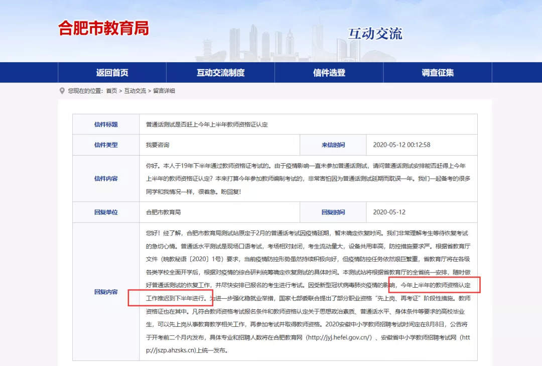 信件內(nèi)容:你好。本人于19年下半年通過(guò)教師資格證考試的。由于疫情影響一直未參加普通話測(cè)試,請(qǐng)問(wèn)普通話測(cè)試安排能否趕得上今年上半年的教師資格證認(rèn)定?本來(lái)打算今年參加教師編制考試的,非常害怕因?yàn)槠胀ㄔ挏y(cè)試延期而耽誤一年。我們一起備考的很多同學(xué)和我情況一樣,很著急。盼回復(fù)!