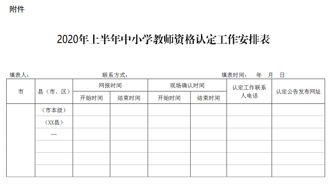 (四)請各市、縣(市、區(qū))教育局填寫《2020年上半年中小學(xué)教師資格認(rèn)定工作安排表》(見附件),由各市匯總后于5月25日前將表格電子版和蓋章掃↔描版報至郵箱(hsy@gxedu. gov. cn)。