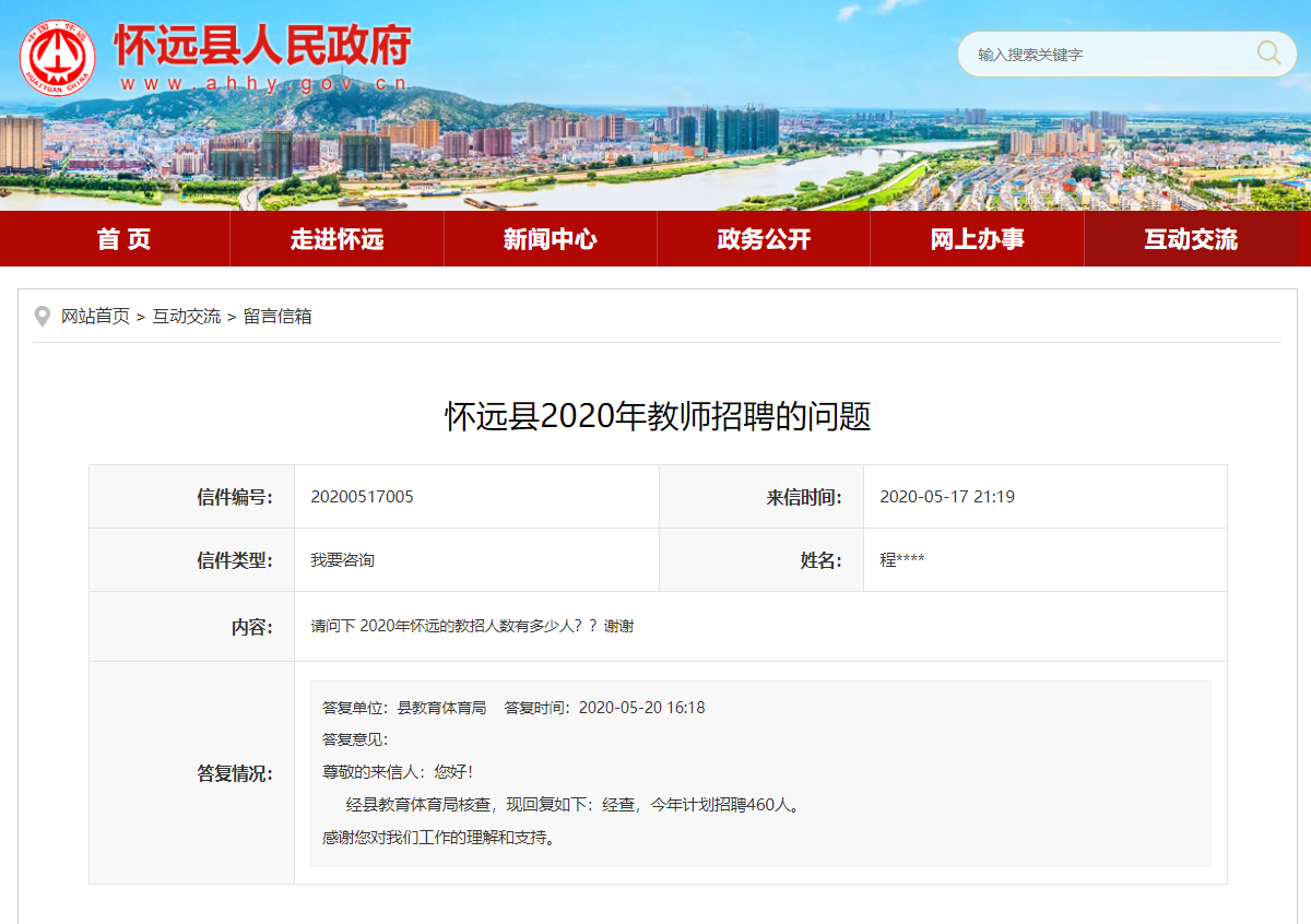 2020蚌埠懷遠縣計劃招聘460人!懷遠縣人民政府留言信箱中,工作人員回復稱2020懷遠縣教師招聘計劃為460人!