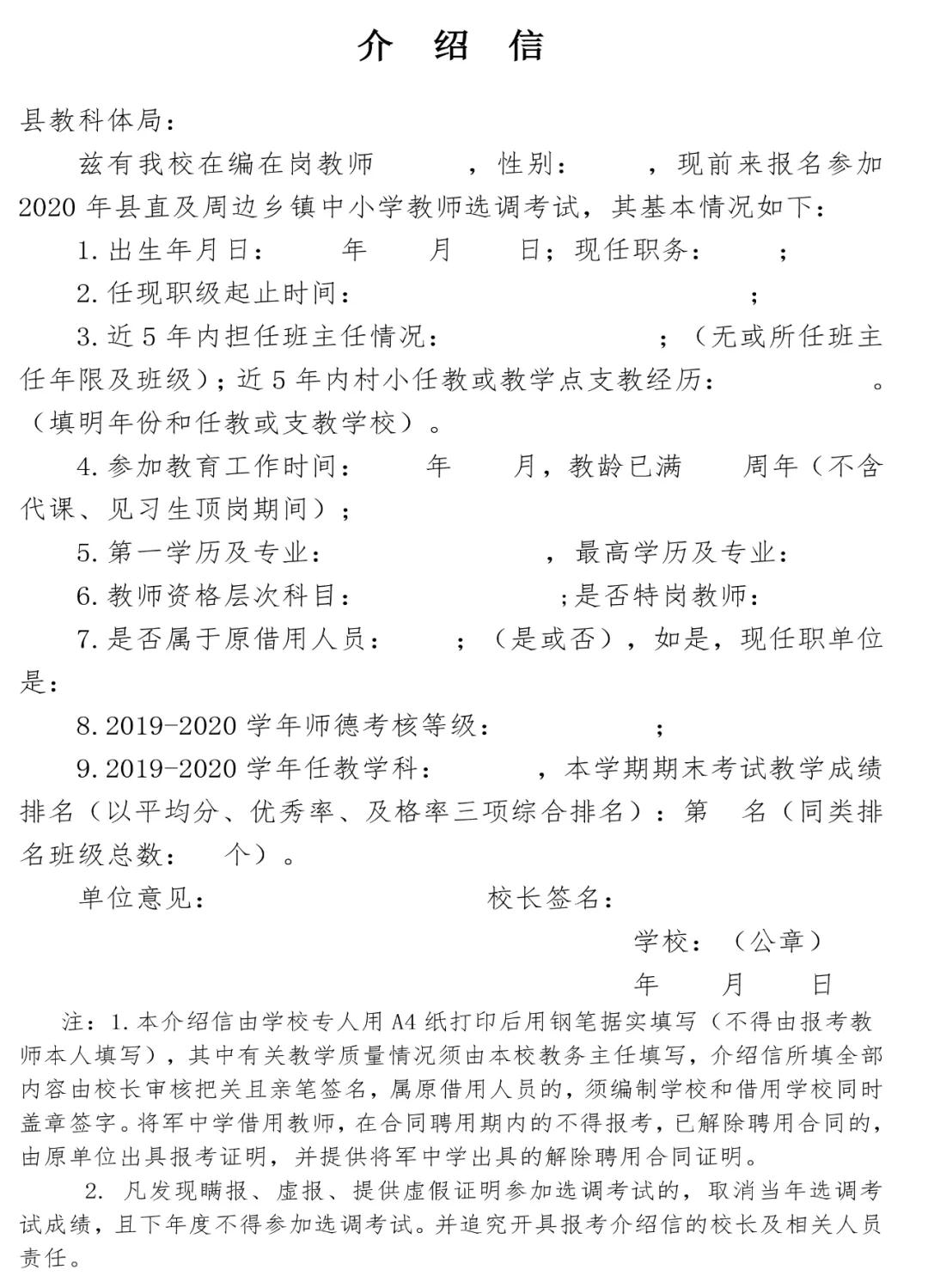 (2)單位介紹信(見附件2,用鋼筆如實填寫,其中有關(guān)教學(xué)質(zhì)量情況須由本校教務(wù)主任填寫,介紹信所填全部內(nèi)容由校長審核把關(guān)且親筆簽名,屬原借用人員的,須編制學(xué)校和借用學(xué)校同時蓋章簽字)。將軍中學(xué)借用教師,在合同聘用期內(nèi)的不得報考,已解除聘用合同的,由原單位出具報考證明,并提供將軍中學(xué)出具的解除聘用合同證明。