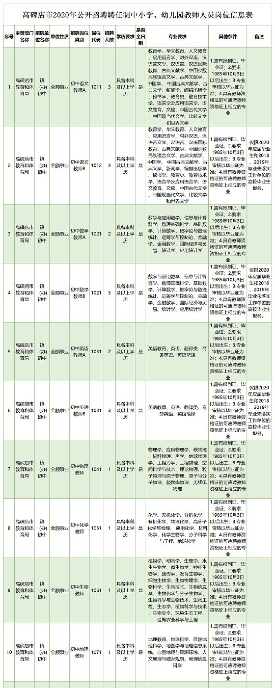 5.各崗位專(zhuān)業(yè)要求詳見(jiàn)《高碑店市2020年公開(kāi)招聘聘任制中小學(xué)、幼兒園教師人員崗位信息表》。