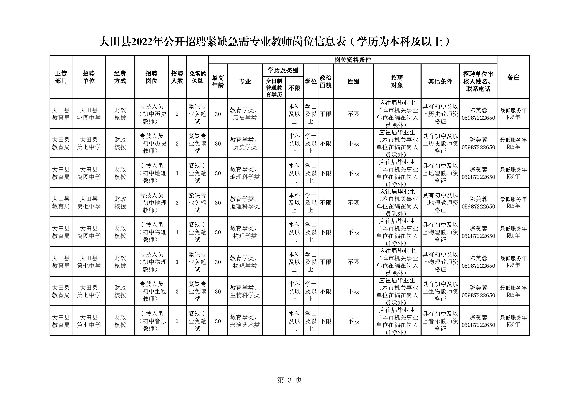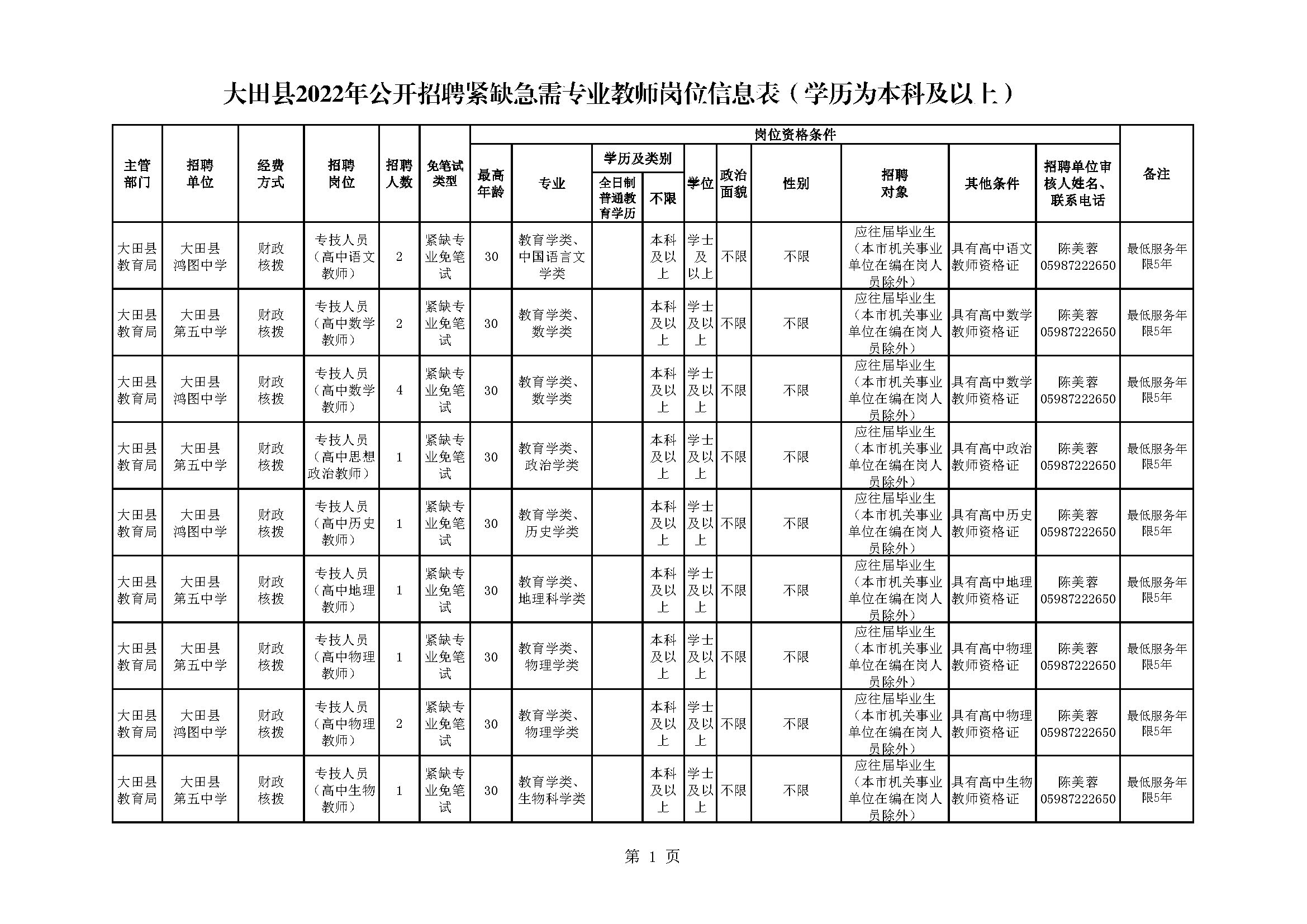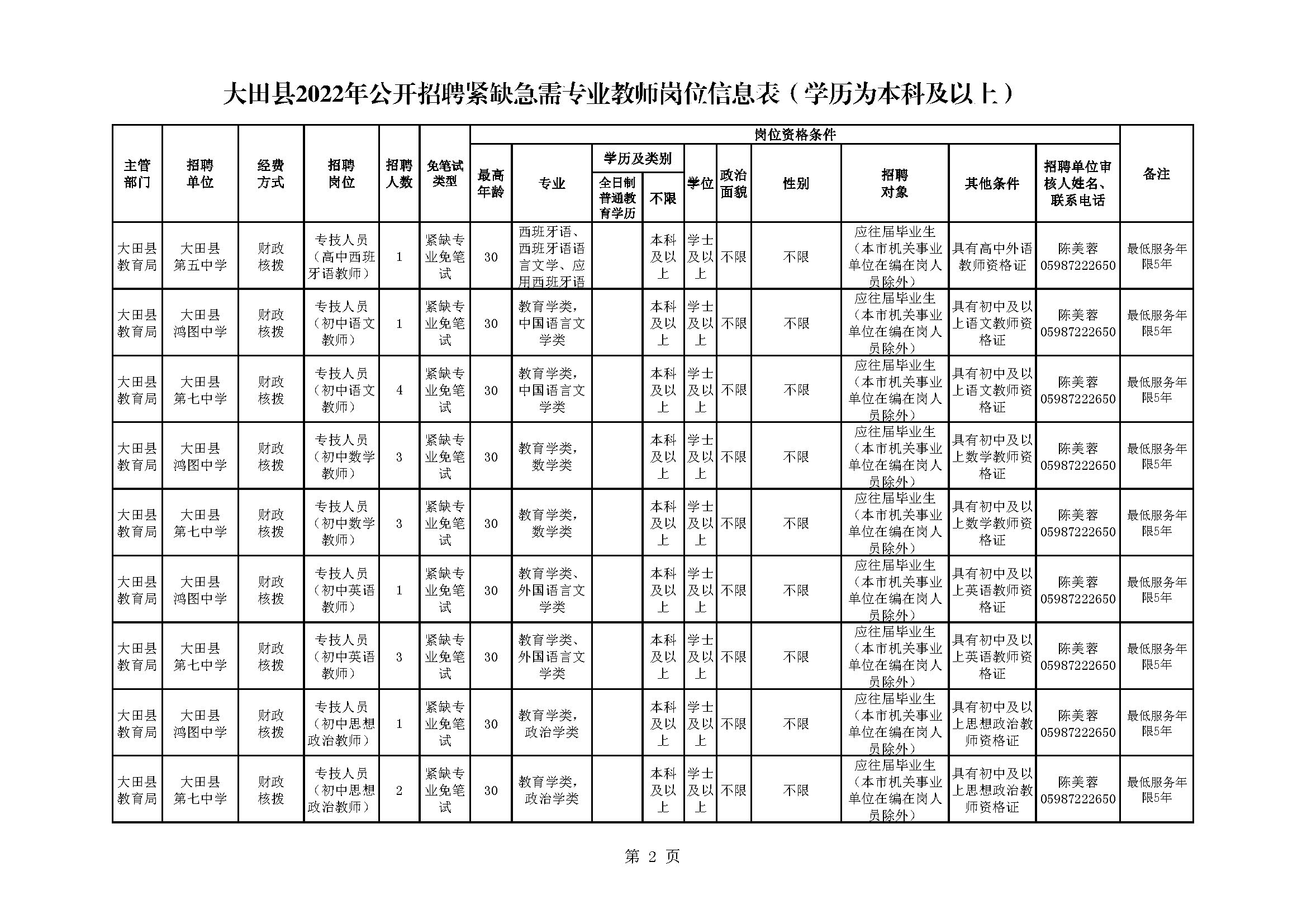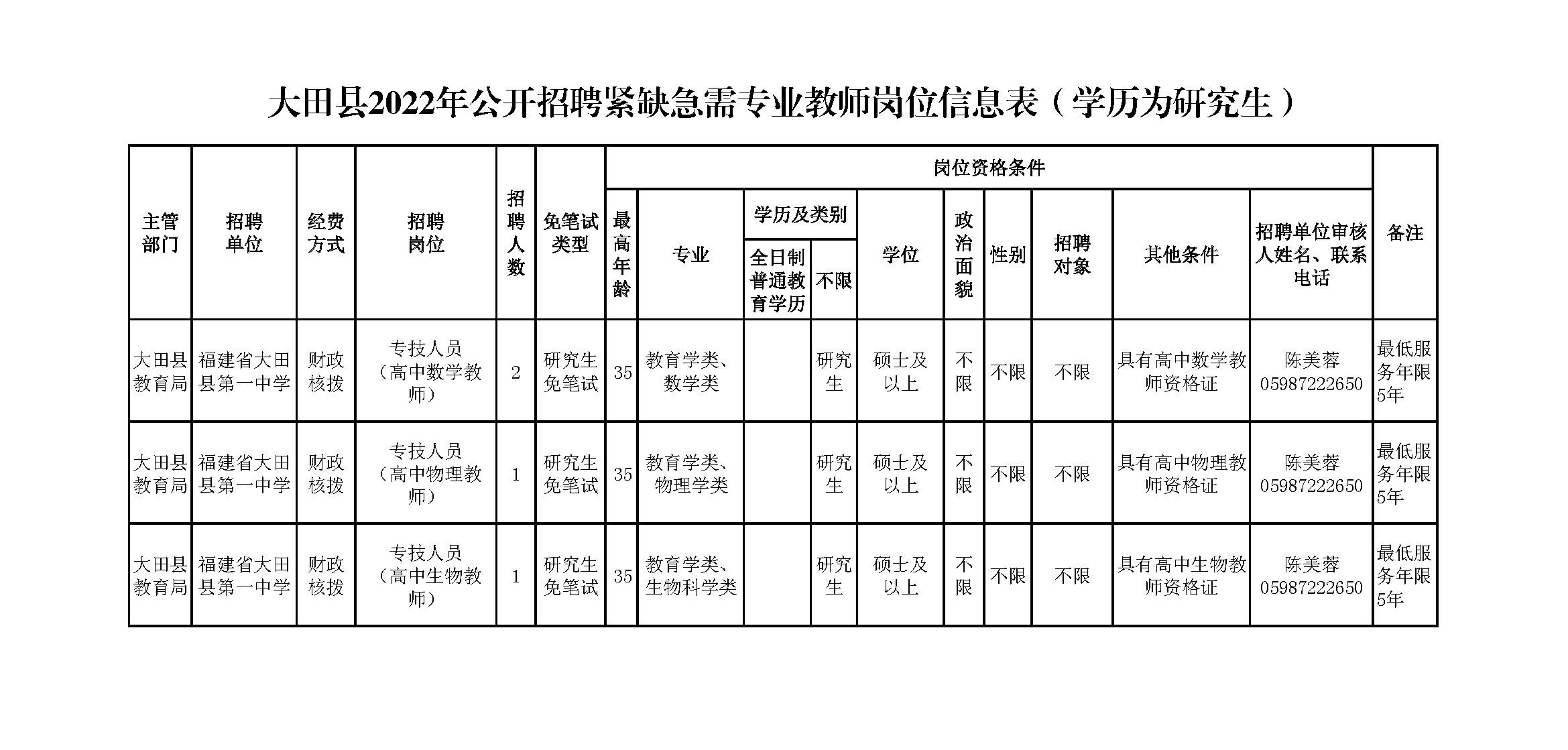 經(jīng)研究,決定于2021年11月13日(周六)上午9:30-12:00在福建師范大學(xué)旗山校區(qū)人文樓廣場(chǎng)招聘緊缺急需專業(yè)教師,招聘條件、辦法與程序具體見大田縣人民政府網(wǎng)站(“教育信息-通知公告”)2021年10月13日發(fā)布的《大田縣2022年緊缺急需專業(yè)教師公開招聘方案》。招聘崗位如下: