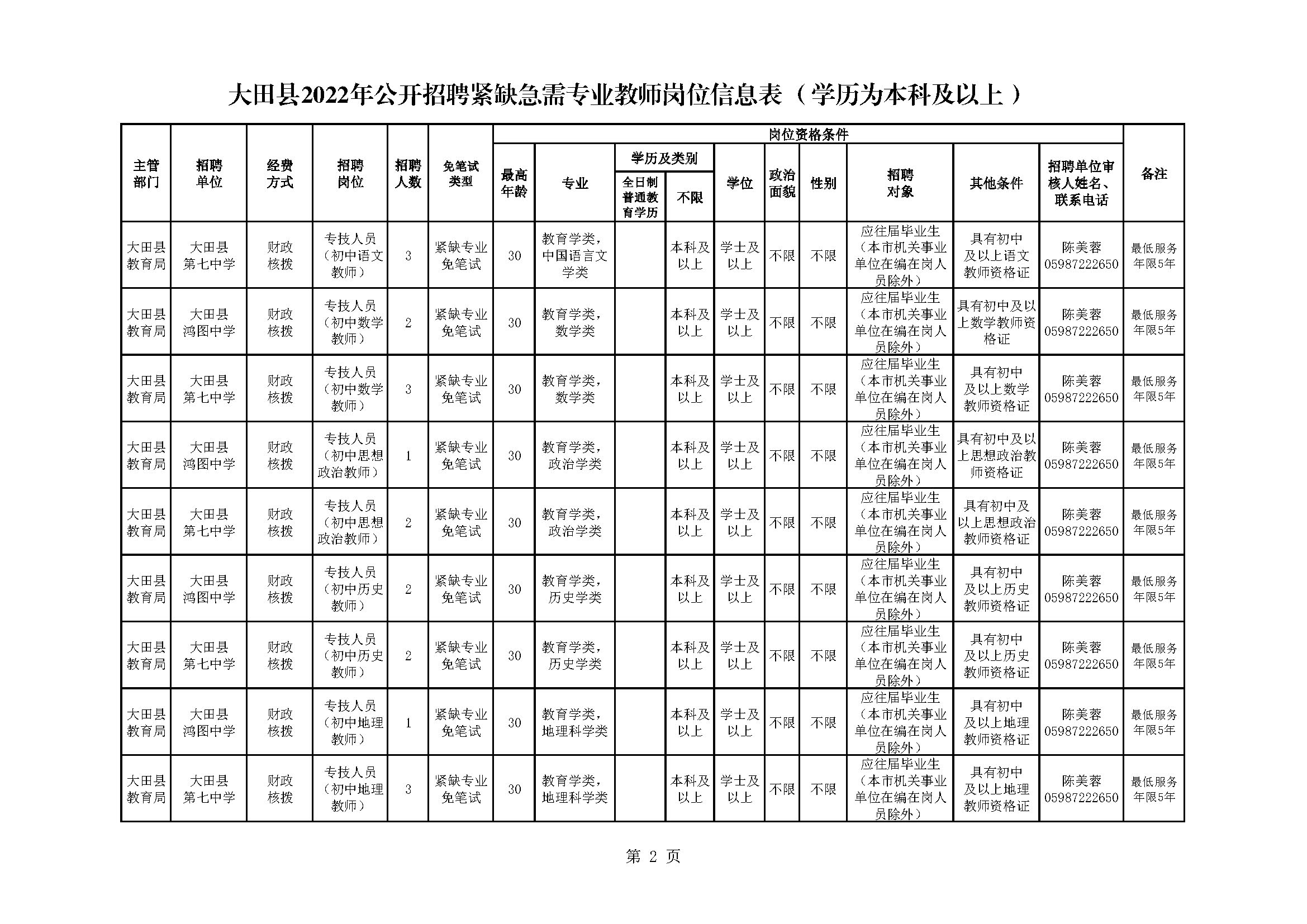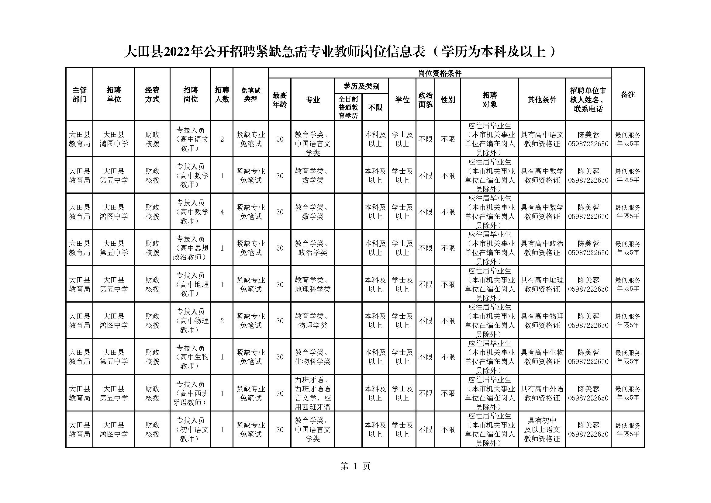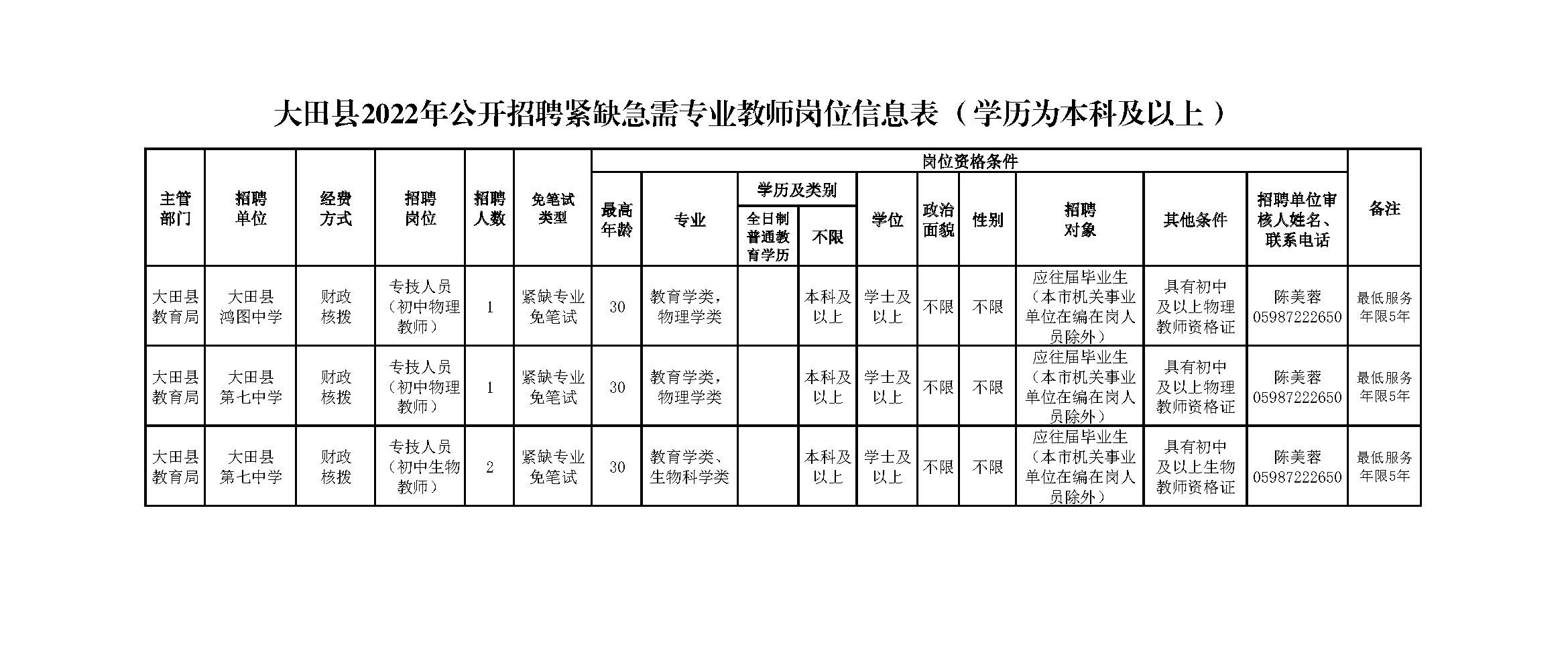 經(jīng)研究,決定于2021年11月20日上午9:00-12:00在三明學院藝術(shù)樓招聘緊缺急需專業(yè)教師,招聘條件、辦法與程序具體見大田縣人民政府網(wǎng)站(“教育信息-通知公告”)2021年10月13日發(fā)布的《大田縣2022年緊缺急需專業(yè)教師公開招聘方案》。招聘崗位如下: