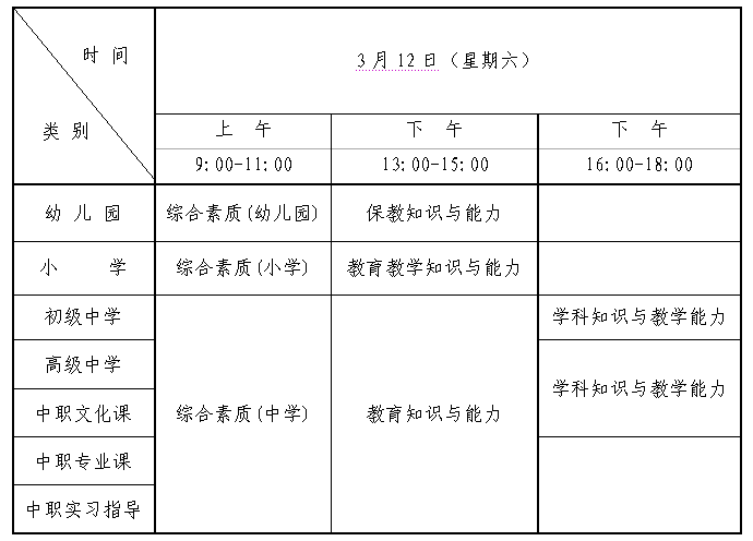 (一)全國(guó)中小學(xué)教師資格考試(筆試)日期為2022年3月12日,具體時(shí)間安排如下: