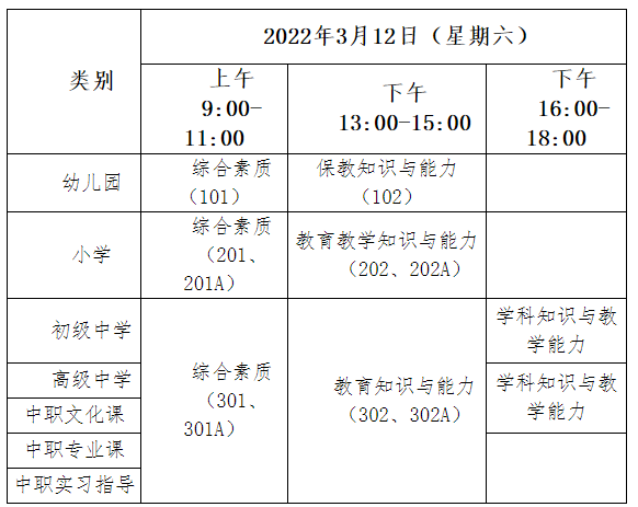 內(nèi)蒙古自治區(qū)2022年上半年全國中小學教師資格考試(筆試)日期為2022年3月12日,具體時間如下: