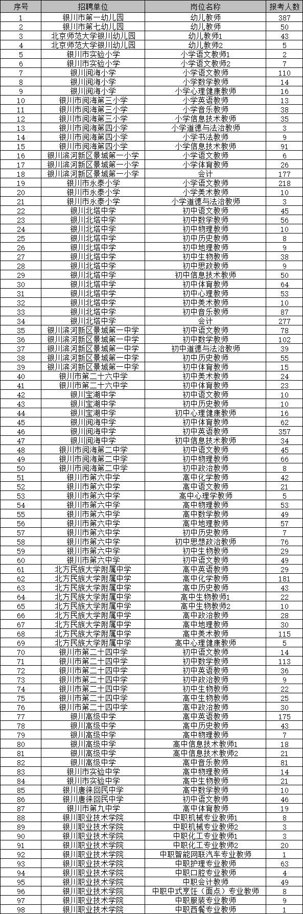 銀川市教育局直屬學(xué)校(幼兒園)2022年自主公開招聘工作人員報(bào)考人數(shù)公示