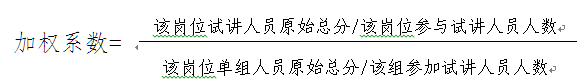 1.試講(面試)滿分為100分,均采取考官平均分,保留小數(shù)點后兩位,不實行四舍五入。為保證同一崗位應(yīng)聘人員成績在不同組中保持公平,采用加權(quán)平均的方式計算個人試講成績,加權(quán)系數(shù)(加權(quán)系數(shù)計算出后不進行四舍五入)具體計算方式為: