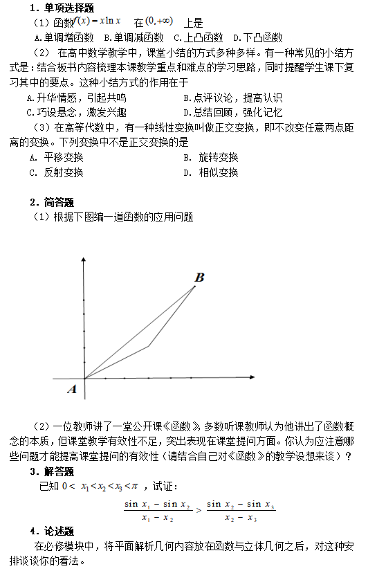 1.?dāng)?shù)學(xué)學(xué)科知識的掌握和運用。掌握大學(xué)本科數(shù)學(xué)專業(yè)基礎(chǔ)課程的知識和高中數(shù)學(xué)知識。具有在高中數(shù)學(xué)教學(xué)實踐中綜合而有效地運用這些知識的能力。