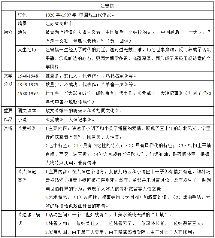 汪曾祺先生博學(xué)多才,經(jīng)歷豐富,歷經(jīng)坎坷,卻心態(tài)平和。作品頗多,令人稱(chēng)贊。經(jīng)過(guò)總結(jié)分析之后,??贾R(shí)點(diǎn):