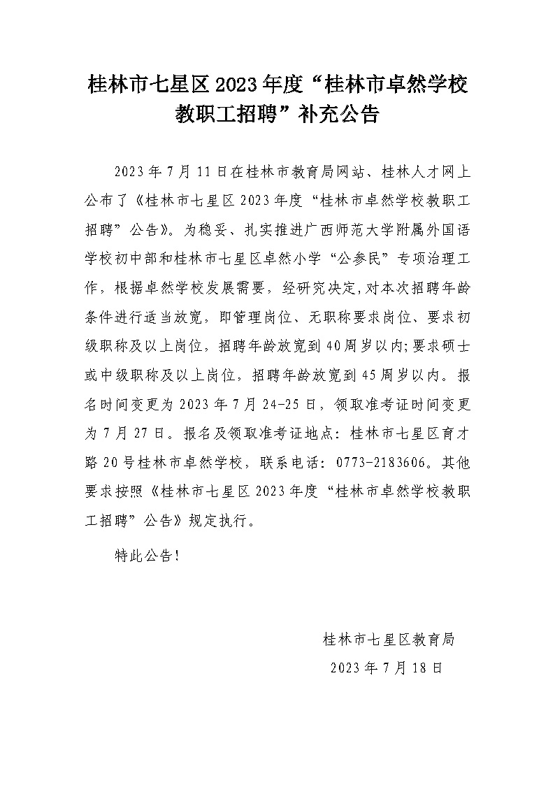 原文標(biāo)題:桂林市七星區(qū)2023年度“桂林市卓然學(xué)校教職工招聘”補充公告_公告公示_桂林市教育局