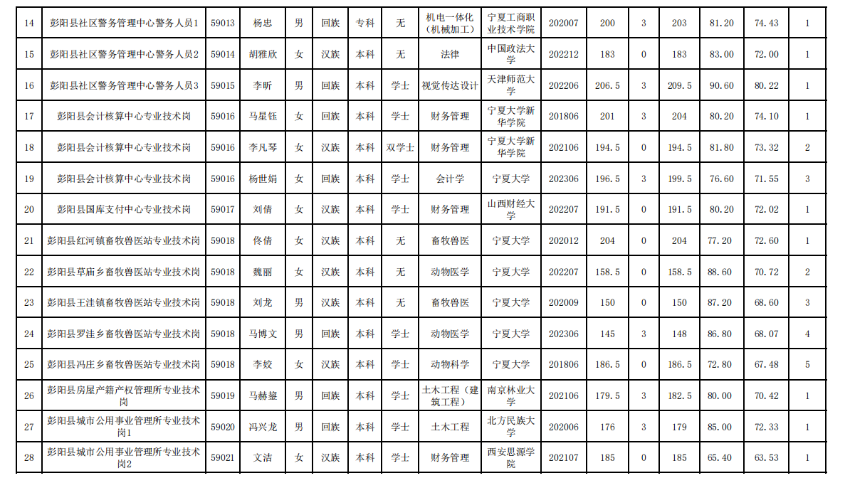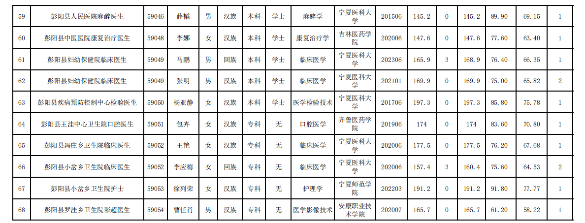 根據(jù)《寧夏回族自治區(qū)事業(yè)單位公開招聘工作人員實施辦法》《寧夏回族自治區(qū)2023年事業(yè)單位公開招聘工作人員公告》要求,經(jīng)發(fā)布公告、網(wǎng)上報名、筆試、資格復審、面試、體檢、考察等程序,現(xiàn)對我縣事業(yè)單位擬聘用的68名工作人員予以公示,公示期為5個工作日,公示時間為2022年8月7日至8月11日。公示期間,如反映公示對象存在問題或問題線索,可采取來信來訪、打電話等方式,向彭陽縣人力資源和社會保障局舉報。來信請寄:彭陽縣人力資源和社會保障局辦公室,郵編:756500,舉報電話:09547012386、7012396。接受電話舉報和來訪舉報時間為公示期間每天上午8:30—12:00,下午14:30—18:30。