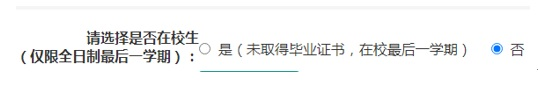 (2)“申請(qǐng)地類(lèi)型”選擇:在戶籍所在地申請(qǐng)認(rèn)定的選擇“戶籍所在地”,在持有的居住證所在區(qū)縣申請(qǐng)認(rèn)定的選擇“居住地”;現(xiàn)役軍人和現(xiàn)役武警選擇“居住地”。 全日制普通高校非在校最后一學(xué)期的在讀專(zhuān)升本學(xué)生,必須提供專(zhuān)科學(xué)歷證書(shū)申請(qǐng);全日制普通高校非在校最后一學(xué)期的在讀研究生,必須提供本科學(xué)歷證書(shū)申請(qǐng)。兩者在報(bào)名系統(tǒng)中填寫(xiě)個(gè)人信息時(shí),下圖中選項(xiàng)必須選擇“否”。