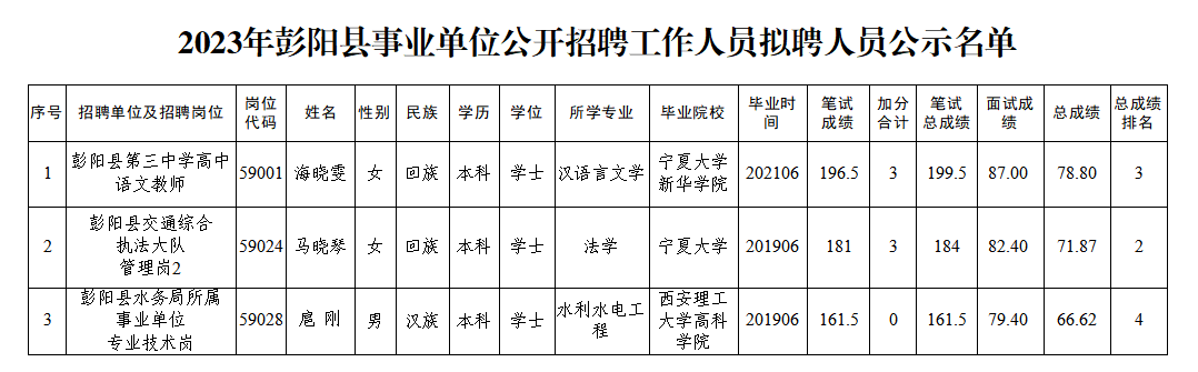原文標題:2023年彭陽縣事業(yè)單位公開招聘工作人員擬聘用人員公示公告_彭陽縣人民政府