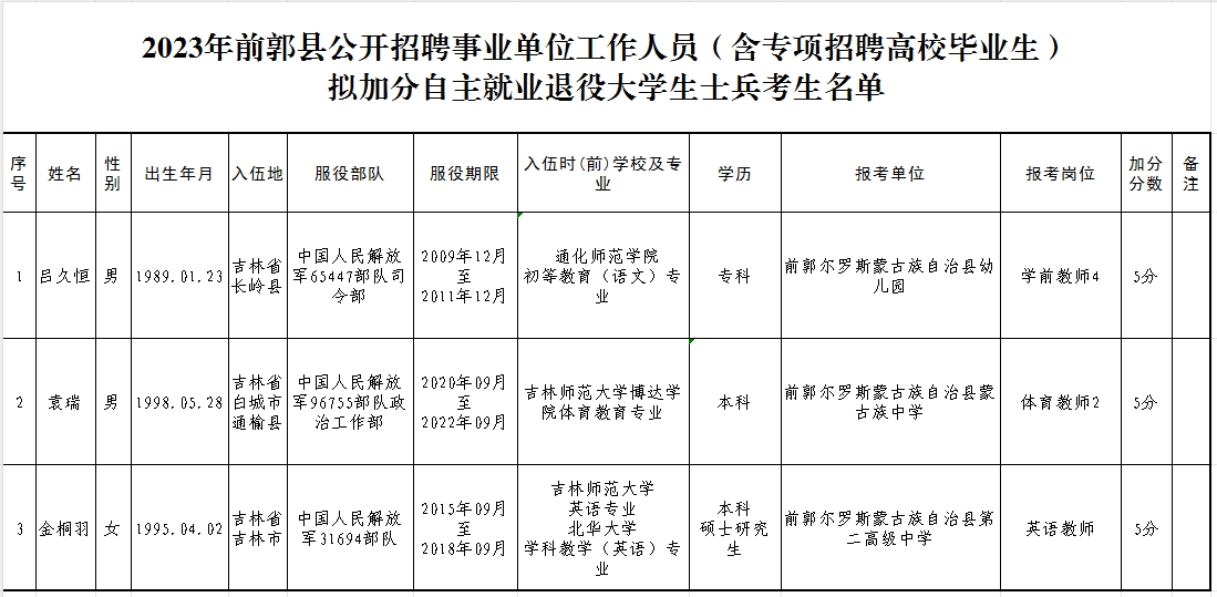 按照《2023年前郭縣公開招聘事業(yè)單位工作人員(含專項招聘高校畢業(yè)生)公告》中關于“根據(jù)《關于促進新時代退役軍人就業(yè)創(chuàng)業(yè)工作的實施意見》(吉退役軍人發(fā)〔2019〕30號)精神,對凡在我省參軍入伍并服役期滿、退出現(xiàn)役,且符合報考條件的自主就業(yè)退役大學生士兵考生,享受筆試初始成績(百分制)加分政策。其中,一般自主就業(yè)退役大學生士兵加5分,榮立三等功的加7分,二等功的加9分,一等功的加11分。多次立功的按立功最高等次加分,其余立功次數(shù)不累計加分。”的規(guī)定,經本人在有效期內申請,縣人力資源和社會保障局會同有關部門進行聯(lián)合審驗,確定呂久恒等3名考生符合加分條件,現(xiàn)面向社會進行公示,歡迎廣大考生和社會各界進行監(jiān)督。