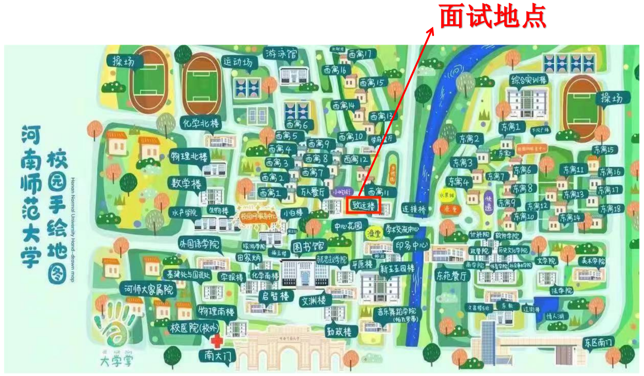 四、面試時間:2024年3月26日-3月27日,面試地點:河南師范大學西校區(qū)致遠樓(示意圖見附件5),具體面試時間及面試考場安排詳見附件3。面試時間分上下午場,上午場考生請于7:00前到達致遠樓一樓;下午場考生請于13:00前到達致遠樓一樓。