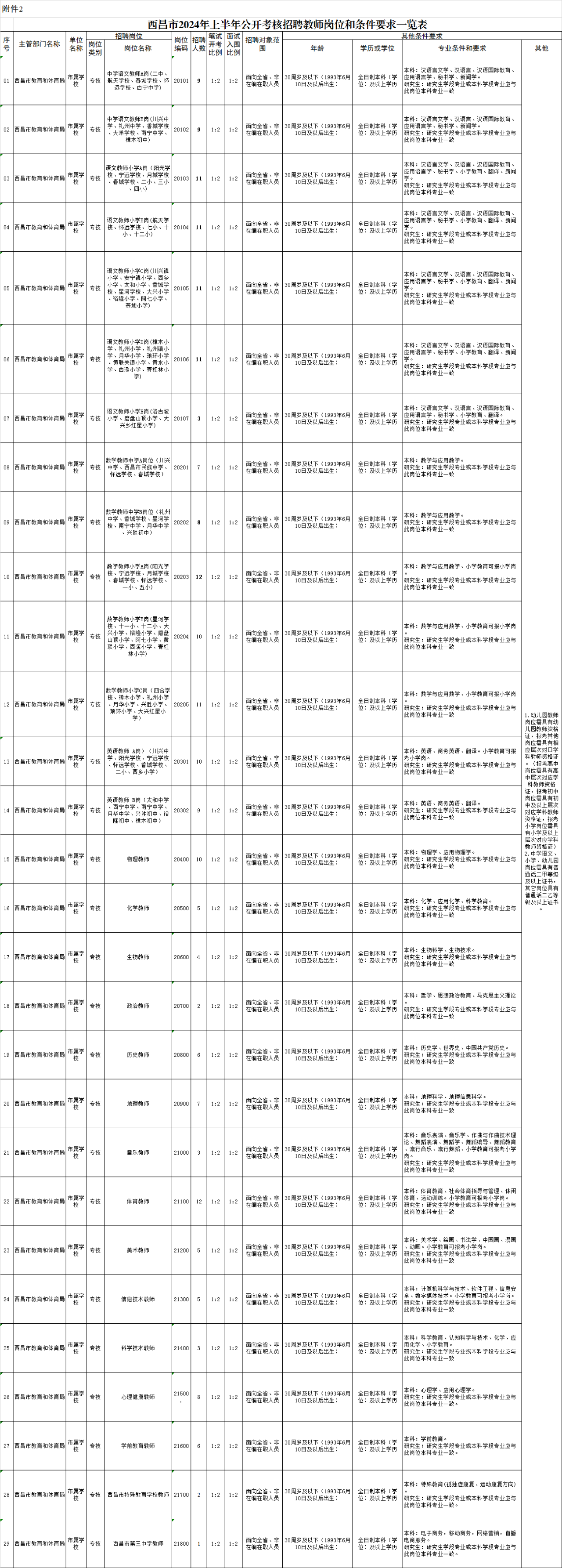 西昌市2024年上半年公開考核招聘教師崗位和條件要求一覽表 |