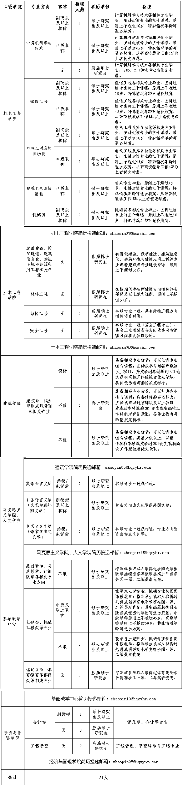 根據(jù)學院發(fā)展需求,現(xiàn)面向社會公開招聘專職教師共計31名,具體事項公告如下: