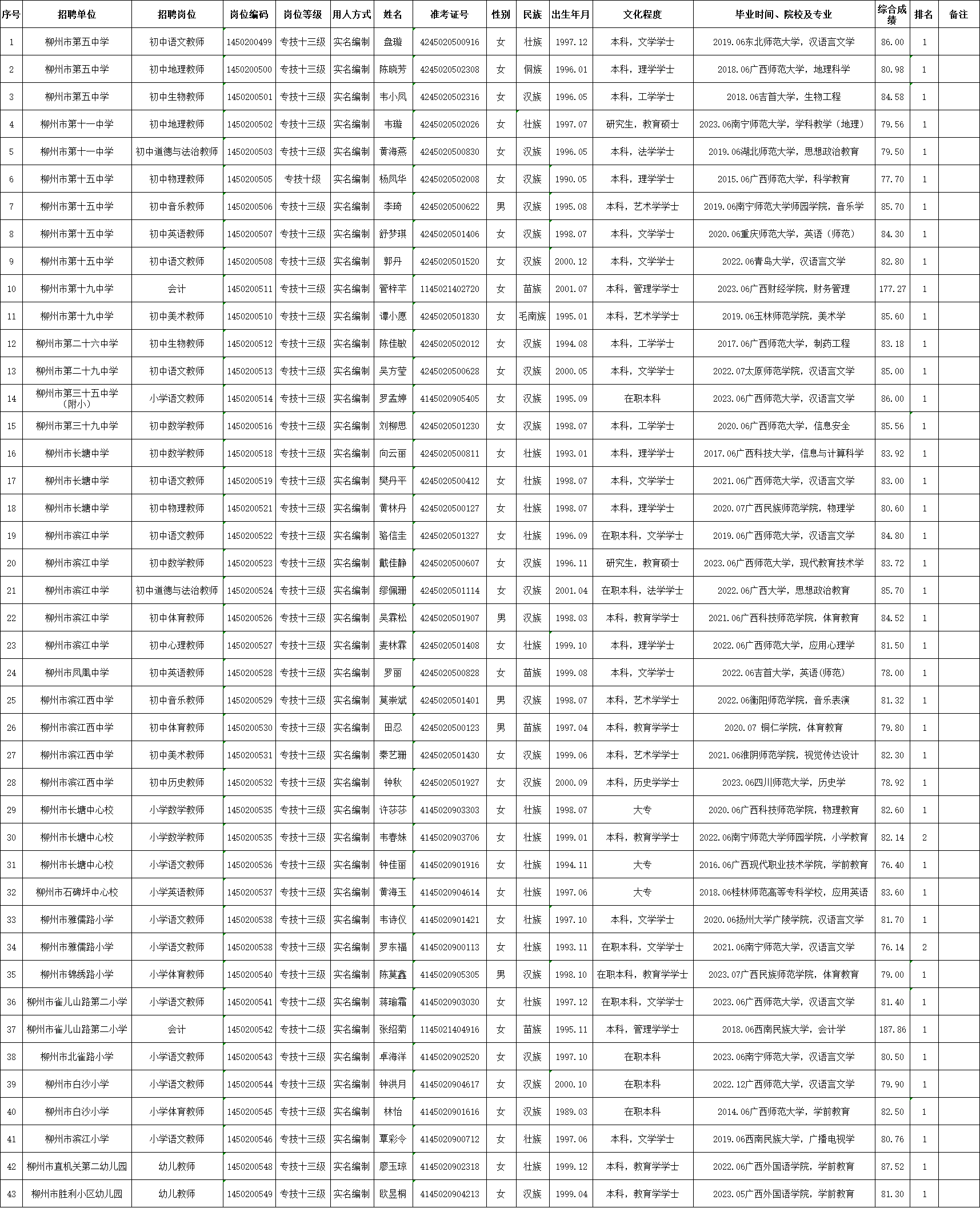 根據(jù)《2024年度柳州市事業(yè)單位公開考試招聘工作人員公告》要求及安排,盤璇等43名同志經(jīng)面試、考核、體檢合格,符合聘用條件。經(jīng)研究決定,擬聘用盤璇等43名同志為我區(qū)事業(yè)單位工作人員,現(xiàn)予以公示,公示期為7日(2024年7月11日至2024年7月17日)。對擬聘用的同志如有異議,請以書面形式,并署真實姓名和聯(lián)系地址,于2024年7月17日前郵寄或直接送我單位(郵寄地址:柳州市勝利路12-8號柳北區(qū)政府3樓307室;郵編:545002,電話0772-2539121),群眾如實反映有關(guān)問題受法律保護。