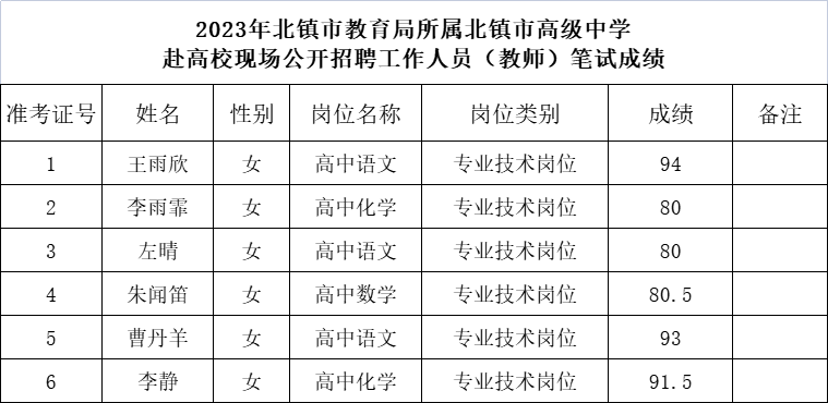 2023年北鎮(zhèn)市教育局所屬北鎮(zhèn)市高級(jí)中學(xué)赴高校現(xiàn)場(chǎng)公開招聘工作人員(教師)筆試閱卷工作于2024年7月16日結(jié)束,現(xiàn)公示考試成績(jī)。