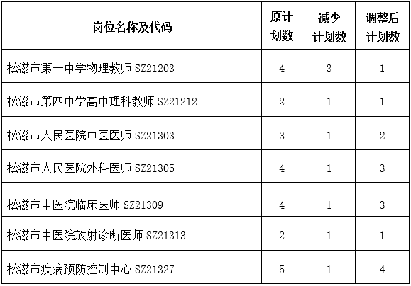 根據(jù)各崗位通過資格復審人員情況,取消5個崗位6人招引計劃數(shù)。減少7個崗位9人招引計劃數(shù)。調(diào)整明細如下: